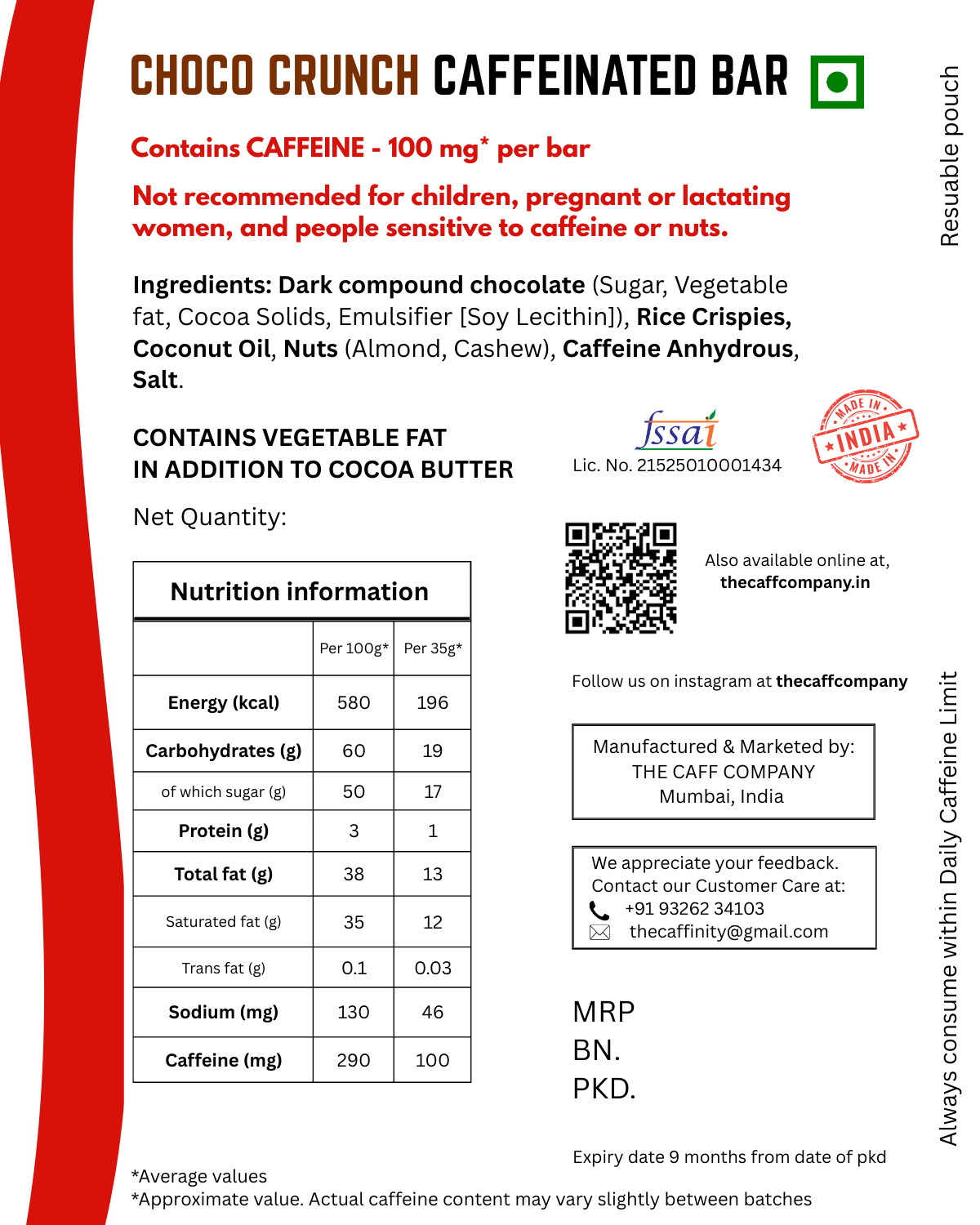 Ingredients: Dark compound chocolate (Sugar, Edible vegetable oil, Cocoa solids, Emulsifiers), Rice Crispies, Coconut OilNuts (Cashews, Almonds), CaffeineVanilla extract (Flavour), Salt